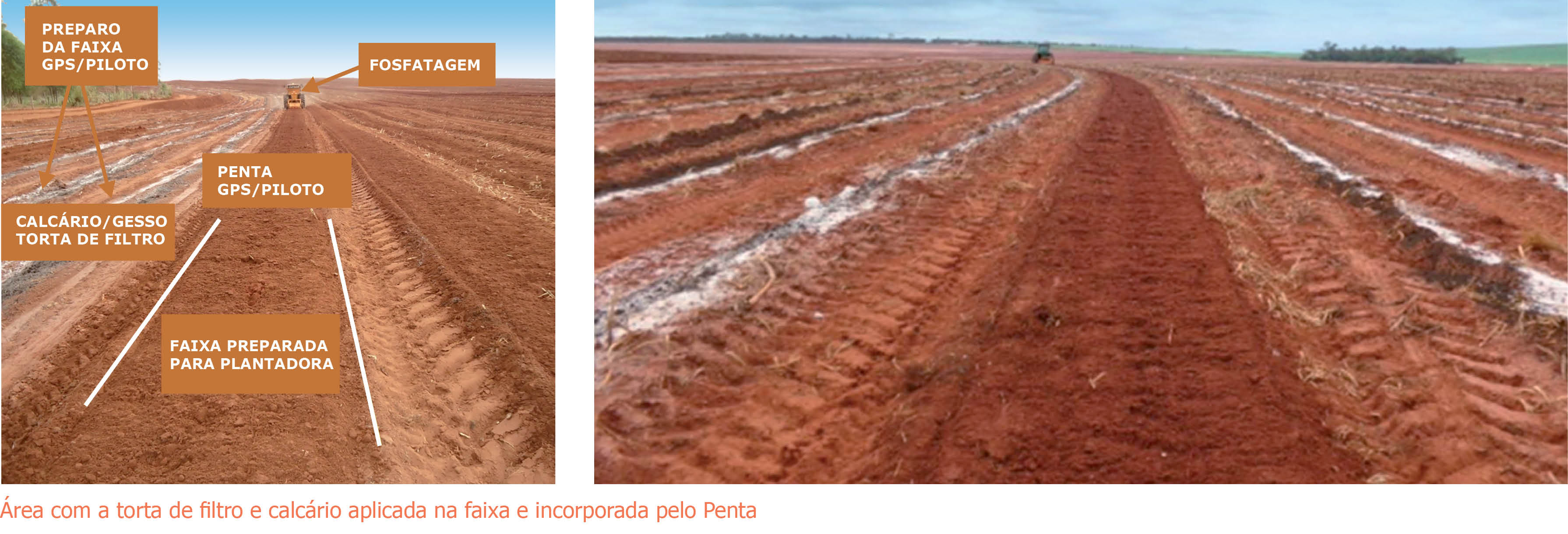 O trabalho de preparo de solo profundo é planejado para ser totalmente georreferenciado do plantio à colheita, e os tratores são equipados com GPS, que permite a perfeita aplicação de calcário, gesso, matéria orgânica (torta de filtro) e fósforo nas faixas, sendo feita sua incorporação pela enxada rotativa.