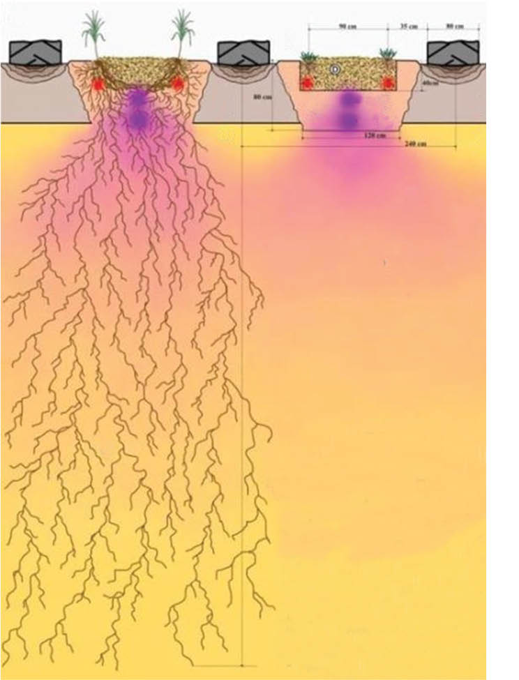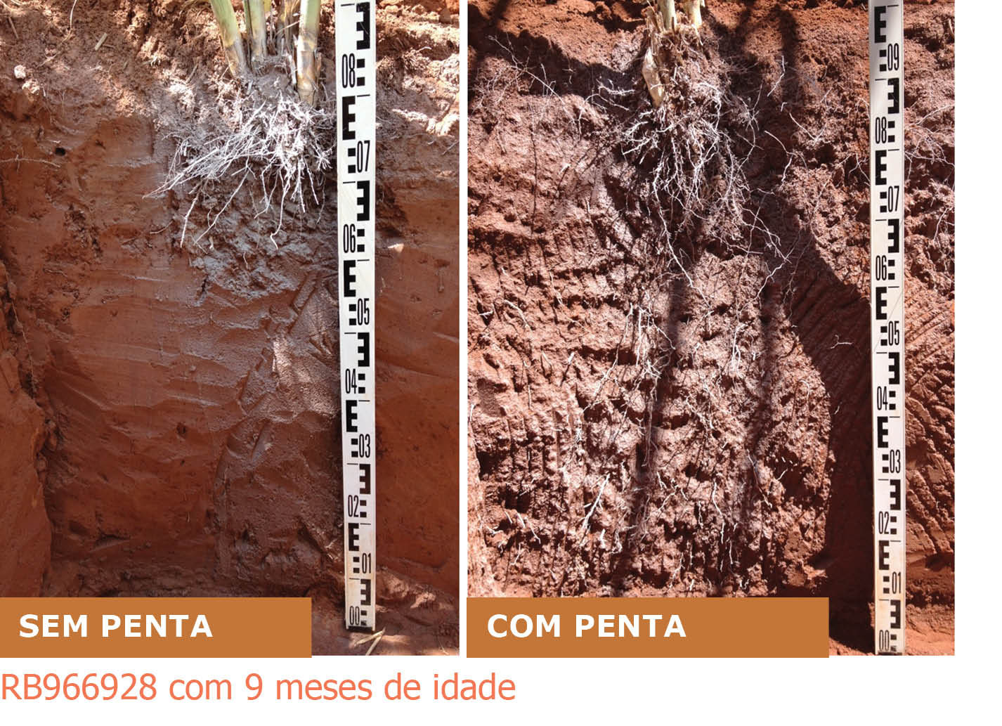 Com relação ao desenvolvimento radicular, realizamos, no período de 2012 a 2014, inúmeras trincheiras para avaliar o comportamento desse sistema radicular, comparando o preparo de solo convencional em relação ao preparo profundo, sendo que o resultado tem sido o que observamos na foto abaixo, em cujo preparo profundo temos um volume de raízes muito maior, mais robusto e desenvolvido em relação ao preparo convencional, sendo que as raízes estão concentradas na faixa dos 90 cm, atingindo a profundidade de 80-100 cm, enquanto, no preparo convencional, dificilmente ultrapassam a 40-45 cm.