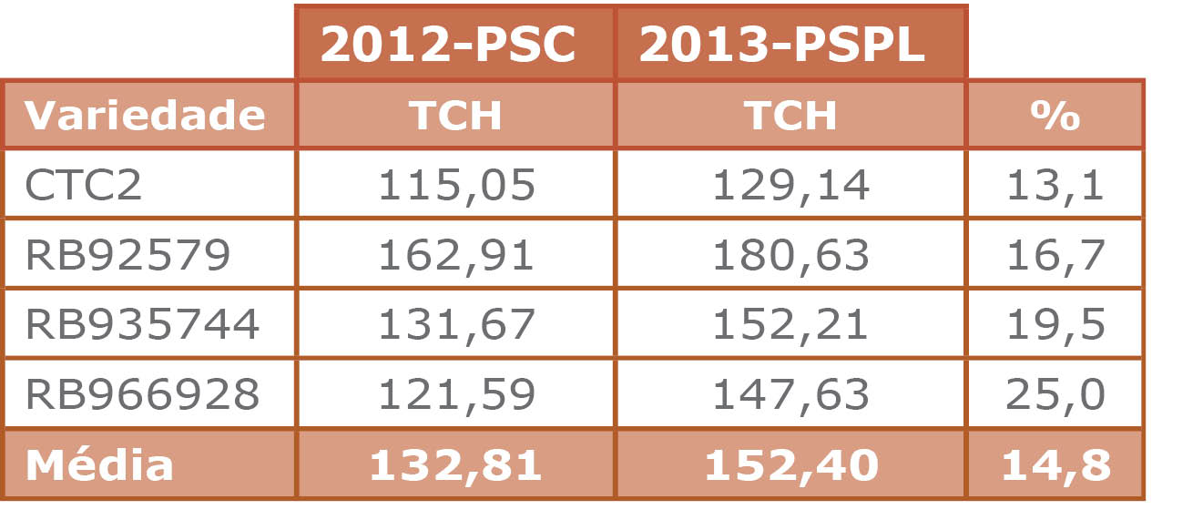 Outra vantagem que observamos é uma menor queda de produtividade entre os cortes, aumentado o TCH médio e projetando um aumento na quantidade de cortes por ciclo de plantio. Abaixo, alguns resultados obtidos com o PSPL, em ambientes E1 e D2 (Projeto Ambicana), envolvendo variedades com o estágio de 18 meses, com safras realizadas em 2012 e 2013.